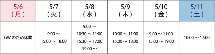 5/6(月)~5/11(土)の予約空き状況